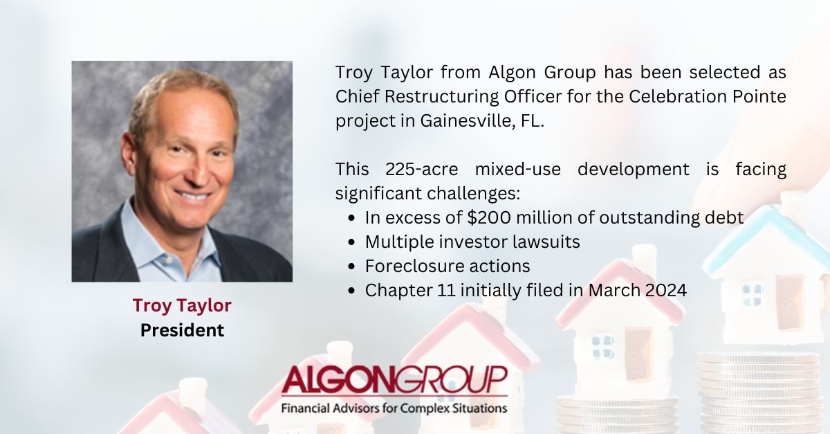 The Algon Group’s Troy Taylor has been appointed Chief Restructuring Officer for the Celebration Pointe mixed-use development in Gainesville, Florida. This 225-acre project exemplifies many of the market trends outlined above – a complex situation involving in excess of $200 million in outstanding debt, multiple investor lawsuits, foreclosure actions and years of deferred financial reckoning that have finally culminated in Chapter 11 proceedings which were initially filed in March 2024.